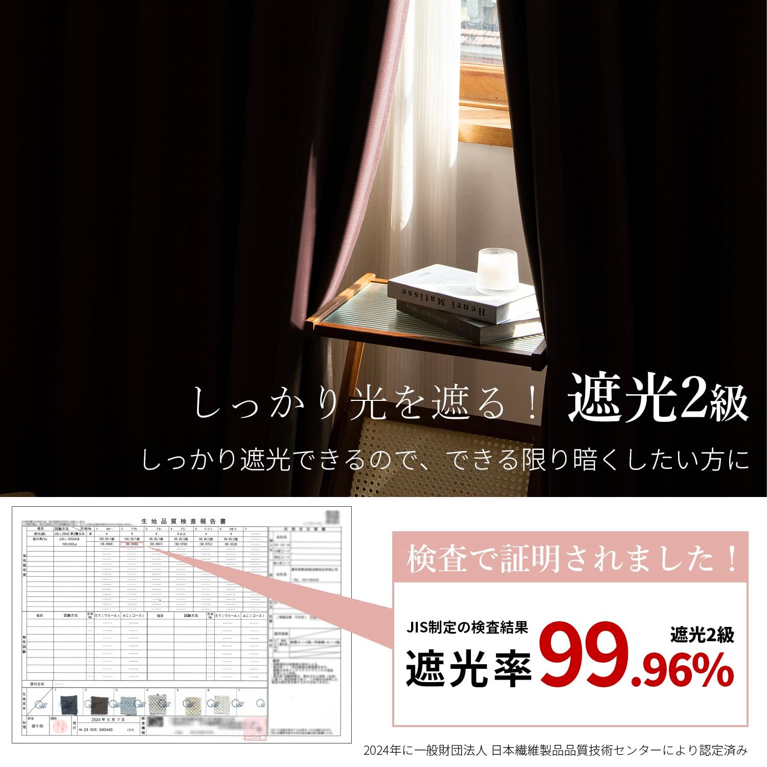 【2級遮光率】厚手3層構造・高密度で高い遮光率を実現。日差しの強い窓でもしっかりと遮光できるので、光が透けにくく、日中に降り注ぐ強い日差しもシャットアウト!専門の検査機関にて遮光率99.95%を取得したものだけを当店では「2級遮光カーテン」とし、豊富な色柄を取り揃えています。※同じ遮光率でも太陽光の強さやカーテン色により遮光効果が異なります。淡色は光が透けやすい性質があるため、より高い遮光性を求める方は濃色をお選び下さい。