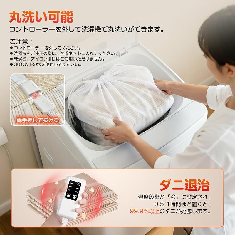 【丸洗いOK・ダニ退治・頭寒足熱配線】電気掛け毛布は手洗いも丸洗いもOK、自宅で洗濯が簡単です。コントローラーを取り外し、電気毛布を洗濯機に入れるだけという簡単な操作でメンテナンスを完了でき、いつも清潔で快適に使用できるようにします。ダニ退治機能も搭載されて、週に 1 回程度、最高温「高」で 1 時間ほど置いて、高温で抗菌・防臭・ダニ退治を同時に実現するため、専用の機器を使用する手間を省きつつ、日常的なダニ対策を徹底できます。電気毛布は「頭寒足熱」の健康理念に基づいて配線の設計を行いました。足元や体全体をしっかりと暖めながら、頭部はブランケットから露出させて涼しさを保つことで、健康的な温度バランスを維持できます。
