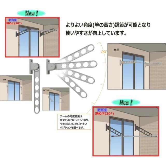 設置後も簡単操作で竿の高さ(角度)を4段階に調整可能なので、より使いやすく、よりベストポジションでの物干しが可能です。