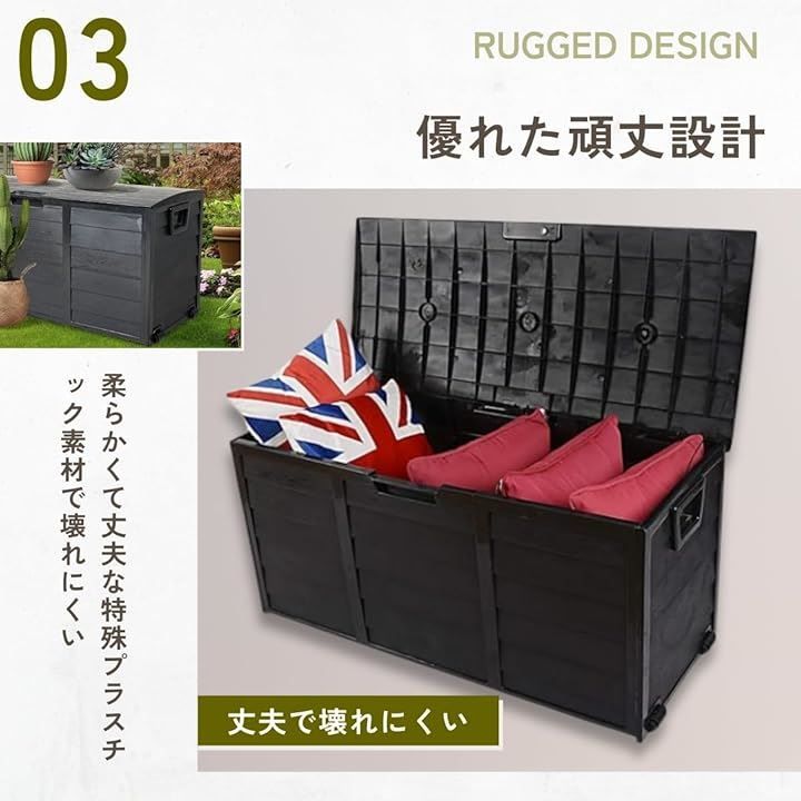 「収納力抜群ボックスで、暮らしをもっと便利に。」 RITAKUの大型収納ボックスは、容量290Lの設計で、屋外や家庭内でのあらゆる収納ニーズに応えます 柔軟で割れにくいPP素材を使用し、縦横に加え斜めの補強材を採用したことで、耐久性と安定感をさらに向上。