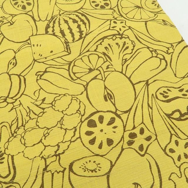 温もり抱く緑黄色の帯地全面に描き込まれた野菜柄のデザインモチーフ、スイカにリンゴ、カボチャやレンコン・ピーマンなど愛らしい癒し柄が醸し出すえも言われぬお洒落感は必見の価値あり!それはモダン創作の奥行そのもの、馴染みの題材ながらもさりげなくお洒落を演出する小粋なセンス…貴女にエレガントな魅力と深みを備えた大人の帯姿を。