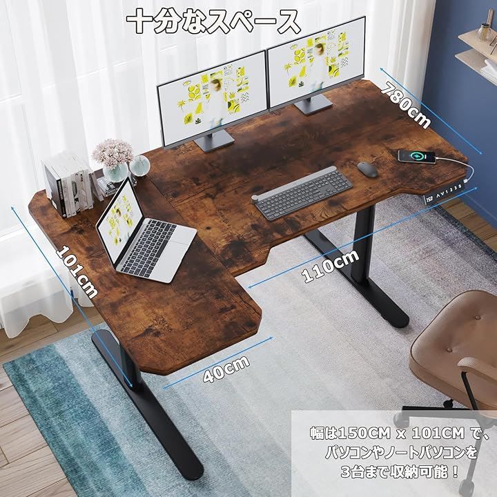 Radlove 昇降デスク パソコンデスク 電動昇降式デスクモーター2基 ゲーミングデスク 机 デュアルモータースタンディングデスク PCデスク つくえ 高さ調節 メモリー機能付き 障害検知 ブラウン 150 x 101 cm
