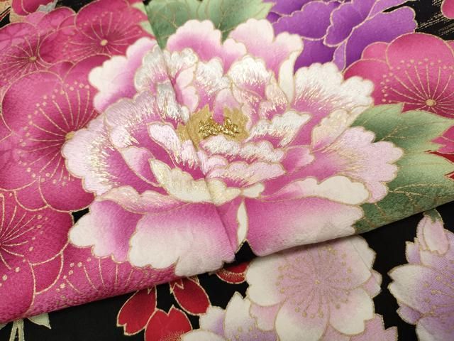 平和屋着物 豪華振袖 刺繍 舞花文 暈し染め 黒地 金彩 正絹 ut