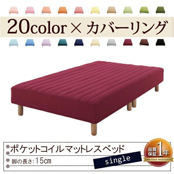 色 寝心地が選べる! カバーリングポケットコイルマットレスベッド 脚15 cm シングル ワインレッド