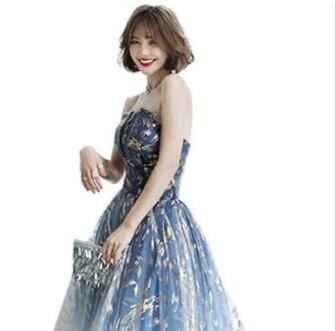 チュールに金のプリントが美しいロングドレス。たっぷりとしたレモン色のサテン地の上に、白のチュールと金の筆書きのようなプリントをあしらった灰青色のチュールをたっぷりと重ねたデザイン性のあるスタイルがとても魅力的です。肩紐のないベアタイプの胸元はしっかりとした固めのチュールを使用し、ずり落ちをカバー。豪華かつ上品で全体的に優しい感じに仕上げています。背中は腰下まで編紐で縛るタイプなので、紐の締め具合でバストサイズとウエストサイズを調整できます。シックでゴージャス。華やかなパーティシーンにぴったりの一着です。背中腰まで編み紐掛け。ファスナーなし。胸パット付き。