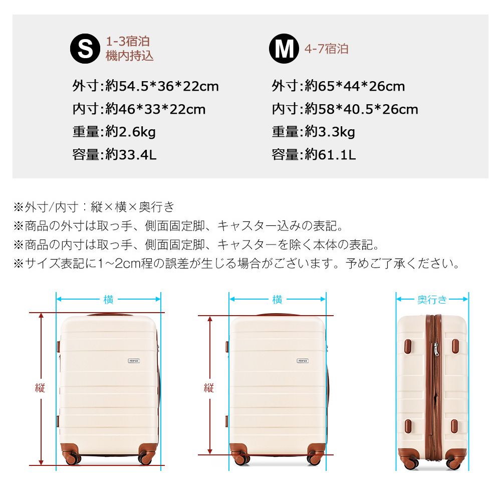 【ご注意】1. 内部ファスナーについて:ケース内部にあるファスナーはメンテナンス専用ファスナーとなります。修理が必要になった場合にのみ使用するファスナーのため、あえてファスナーのつまみが付いていません。お荷物を入れるものではありませんので、ご注意ください。2. Sサイズは寸法のため、側面のハンドルと底足が付いておりません。予めご了承ください。3. 掲数している写真は、ご使用のコンピューター及びスマホのモニターの種類によって、実際の商品のイメージと多少異なることがございます。予めこ了承ください。4. ロットによって、製品の色は多少異なりますので、こ了承とこ理解の程よるしくお願いたします。