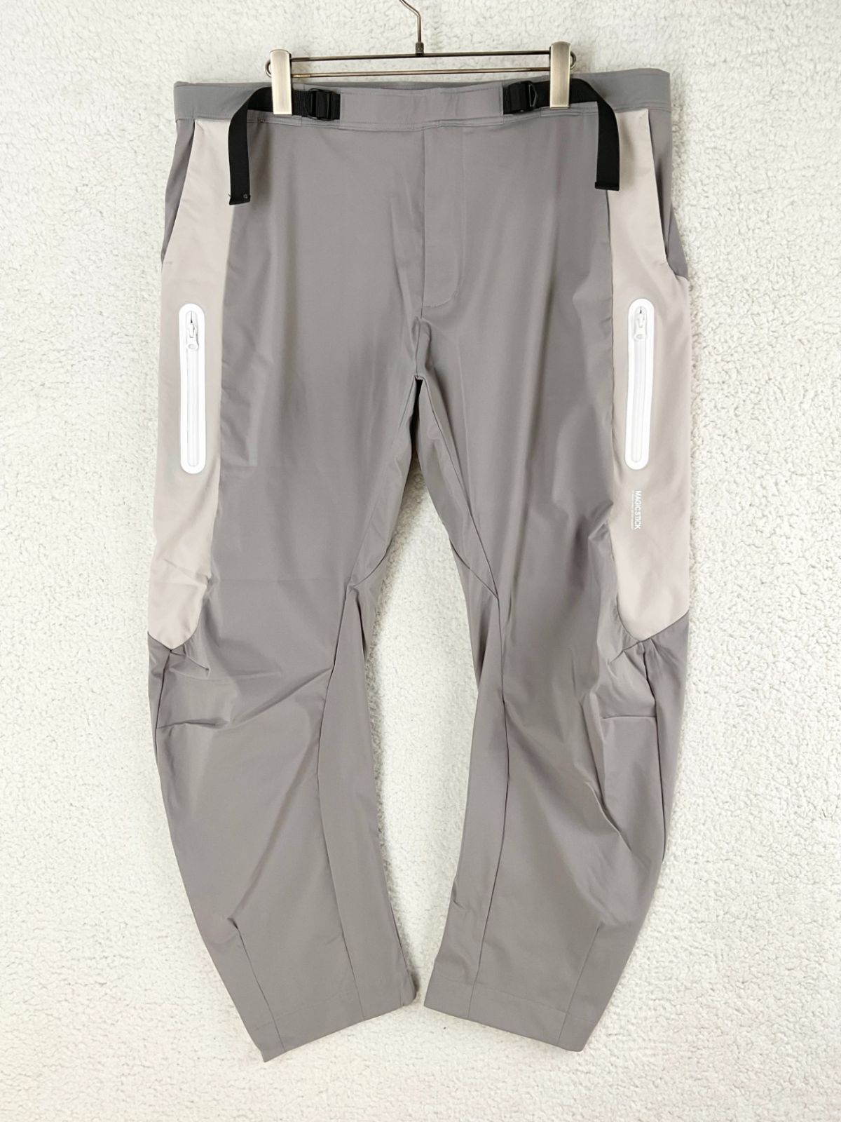 【紹介文】:MAGIC STICKが得意とするスポーツウェアシリーズで、数多く展開し、毎シーズン高い評価を得るトラックスーツの最新モデルをご紹介します。24SSシーズンでリリースした変形サルエルバナナパンツをベースに、テッキーなアレンジを施しました。ブランドらしいヨーロッパテイストのシルエットと高い収納性が魅力です。軽量で高い撥水性能を持つストレッチ3Layerナイロンを採用し、着用時のストレスを軽減しています。追加したポケットは、大手スポーツメーカーの製造背景でしか作ることが難しいシームレスな圧着プリントを使用し、ブランドの高い技術力を証明しています。