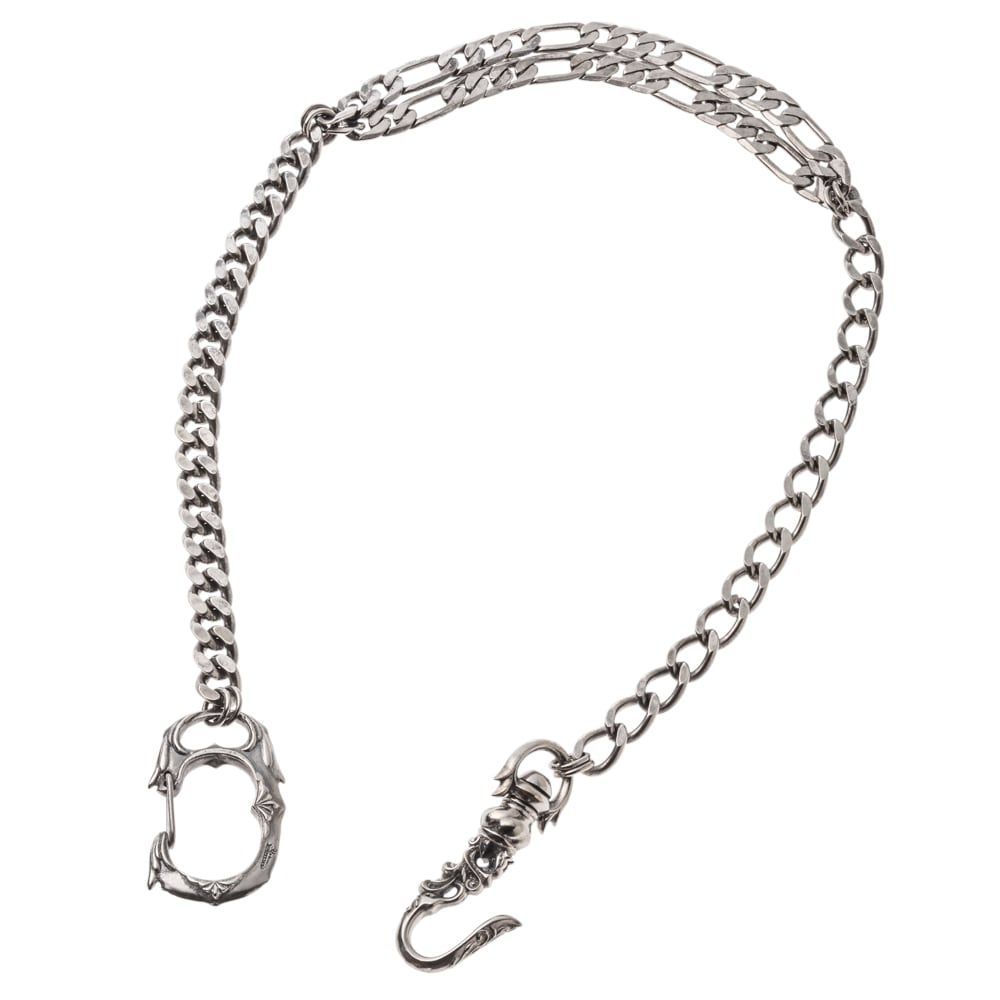 Where substance meets utility. This wallet chain puts a one-touch carabiner at center stage—opening and closing with crisp certainty for secure, fuss-free attachment. Three distinct curb chains are layered to create a dimensional rhythm that catches the light as you move. At the opposite end, a classically styled hook is finely engraved, lending the piece the presence of a pocket-sized sculpture.