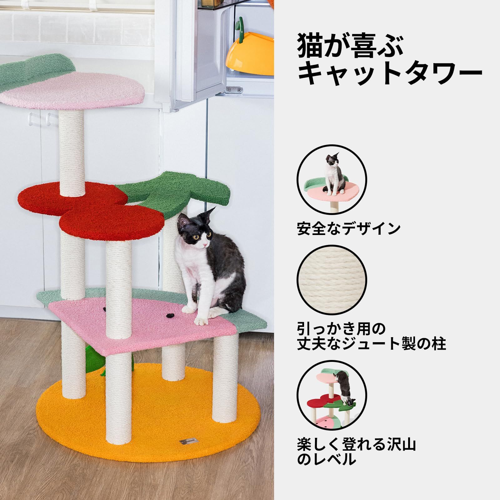 キャットタワー 大型猫用 猫タワー 猫ベッド 大型 据え置き 安定感 省スペース 登りやすい 天然麻紐 爪とぎ 運動不足解消 おしゃれ 猫つめとぎタワー 組立簡単 猫のよじ登る台 - フルーツ型 高さ102 cm