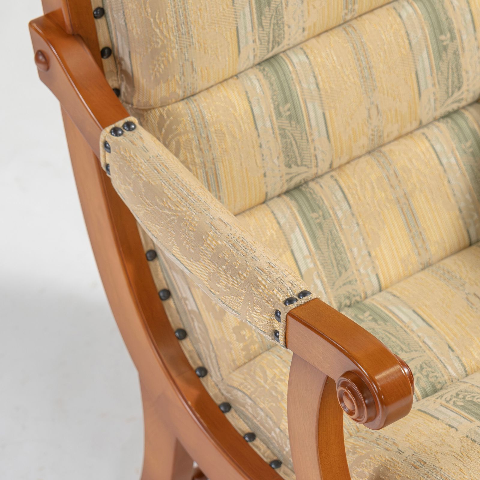 樺桜材の優しい色合いと、ジャカード織ファブリックの繊細な模様が美しく調和し、アーリーアメリカンを思わせる重厚でエレガントな存在感を放ちます。