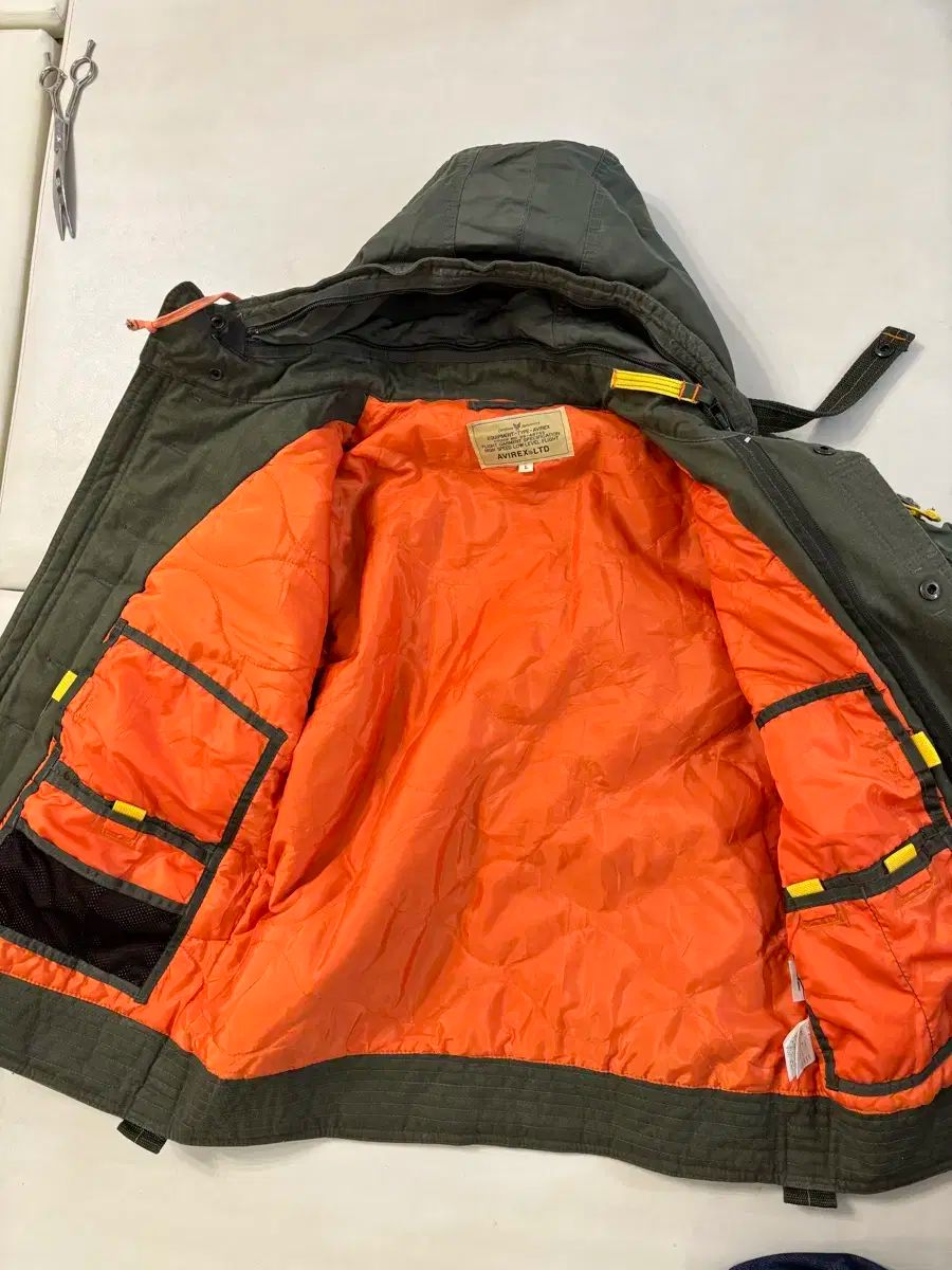 フードは丸めてm65のように収納可能で、黄色のジッパーと独特なポケットディテールがとても 멋집니다.