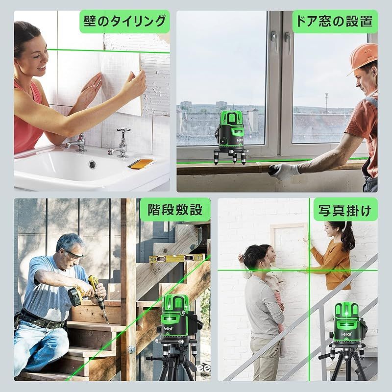 商品名:FELLAT レーザー墨出し器 5ライン グリーンレーザー 墨出しレーザー 高精度 自動水平補正 4方向大矩ライン照射 グリーンレーザー墨出し器 受光器対応 水平器レーザー 地墨ポイント 屋内外DIY/測量/建築 日本語説明書付き