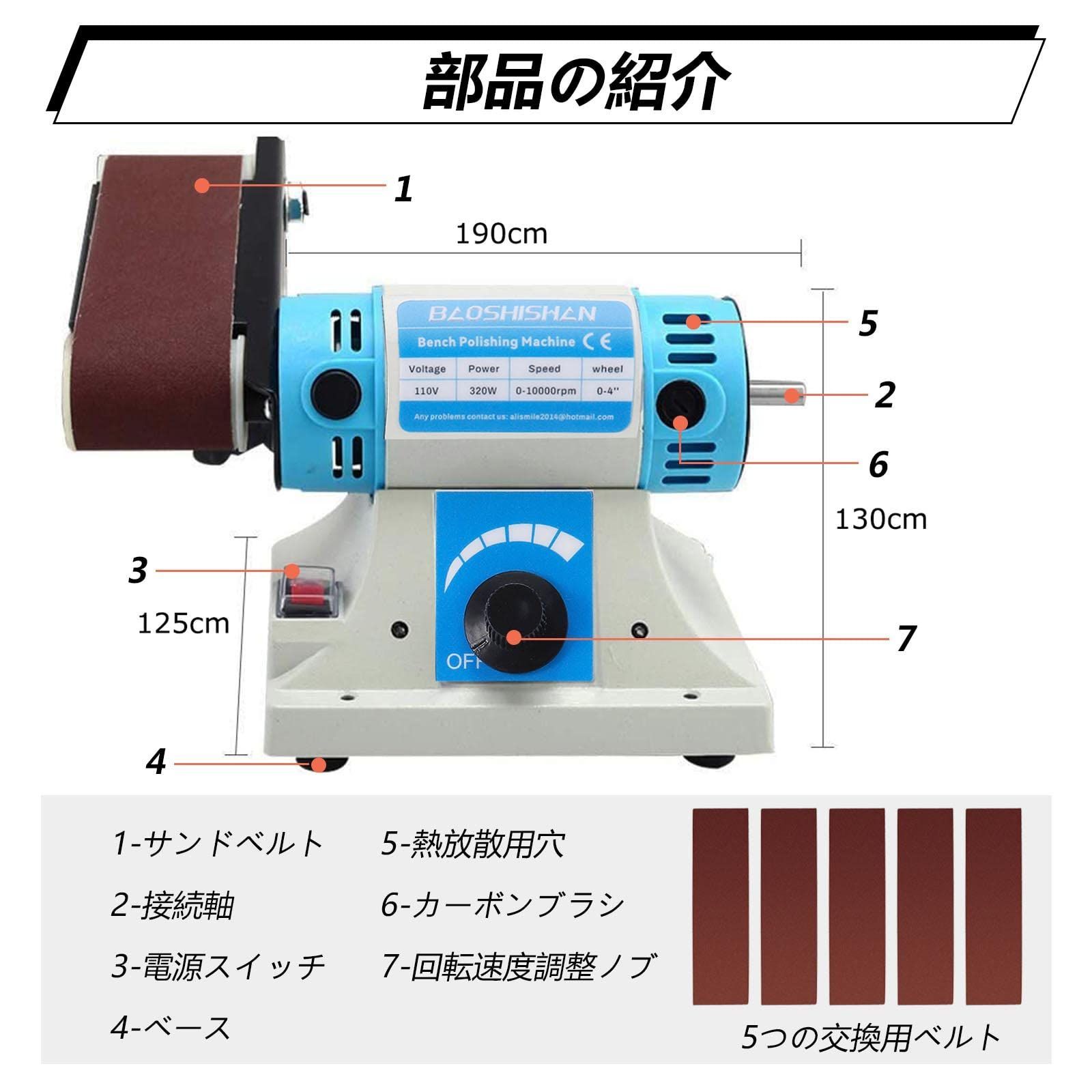 「使いやすい」ボルトは簡単で、調整が便利で、5つの交換用ベルトが付き、研磨ベルトのサイズが自由に交換できます。