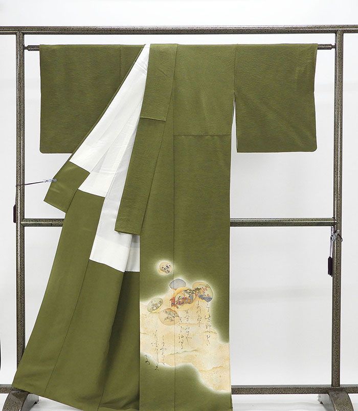 老草色地にベージュや赤錆・ブルーグレーなどの多色と金銀箔で貝合わせや百人一首の和歌模様が柄付けされています。