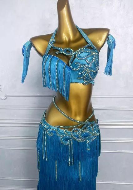 美しいターコイズカラーのフリンジ付きベリーダンスセットアップが新入荷!