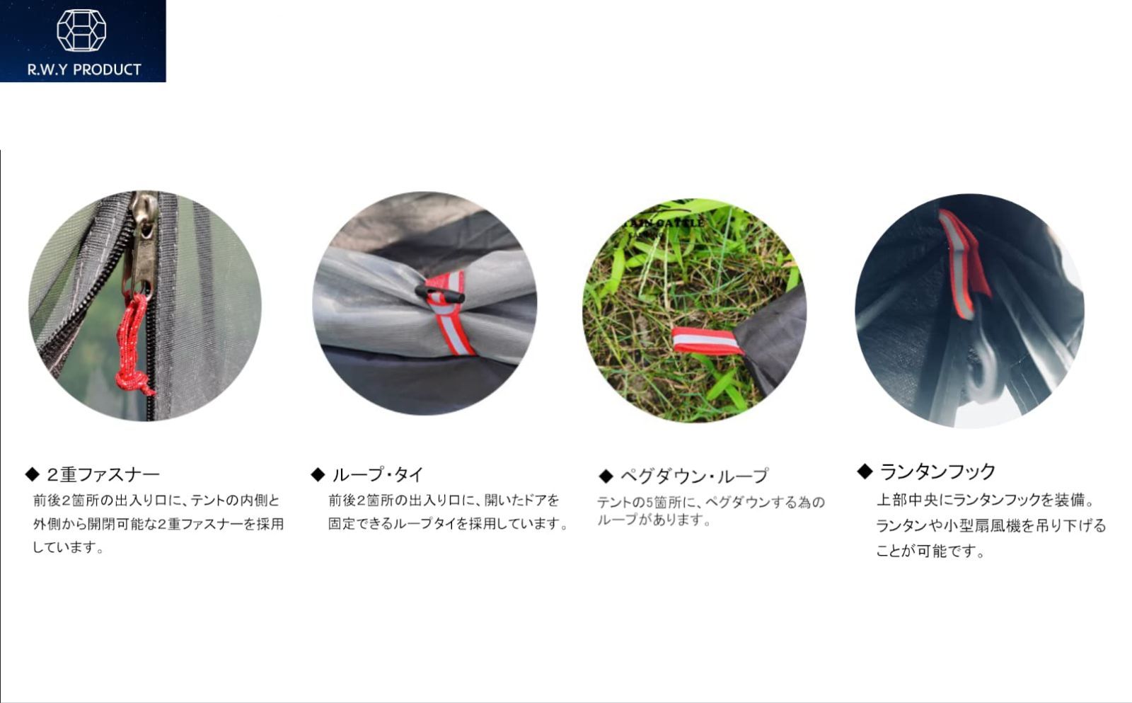 【満足度の上がる快適装備】2箇所の出入口、2重ファスナー、ループ・タイ、ペグダウン・ループ、ランタンフックを装備します。