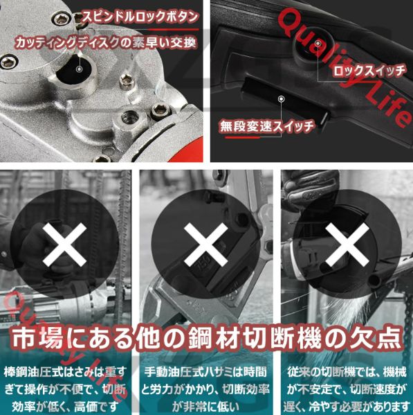 ? 【幅広い用途】主に鉄道建設、橋梁建設、住宅建設、道路、内装および外装装飾、その他の建設現場で使用されます。鋼棒、線材、全ねじロッド、パイプ、コイル、EMT導管、パイプ、防振材が含まれます。ロッドやオイルパイプなどの盗難。 また、火花の発生を最小限に抑えるように設計されているため、さまざまな金属材料を迅速、安全、効率的に切断できます。