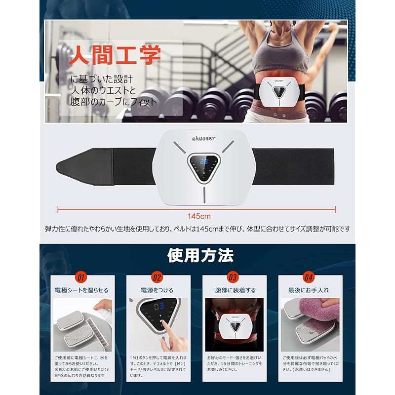 ?【効果が抜群・品質】シンプルかつ高級感あるデザインになっており、運動不足や美しいボディラインを作りたい方々に最適!腹筋ベルト15分のエクササイズはジョギング3500m、腹筋鍛え45分または自由水泳45分に相当します。なかなか落ちないお腹周りの肉を、知らない間に落としてくれる。腰部、大腿、尻にフィットして体多部位に使用できます。梱包詳細:腹筋ベルト*1、Type-Cケーブル*1、スプレーボトル*1、日本語取扱説明書*1。商品に問題があった場合は、弊社までご連絡いただき、迅速に対応させていただきます。