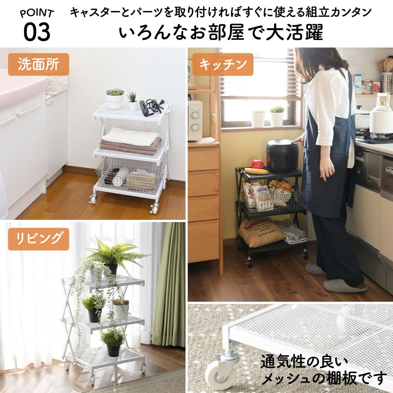 【マルチに使えるワゴン】食品のストック置き場やキッチンラックとして、洗面所でタオルや洗剤を置く台としても、棚板がメッシュのマルチに使えるキャスター付きワゴンです。