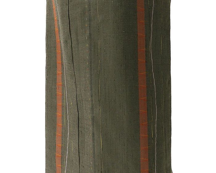 利休茶色地に渋め柿色や黄色・薄紫などで縦縞幾何模様が柄付けされています。