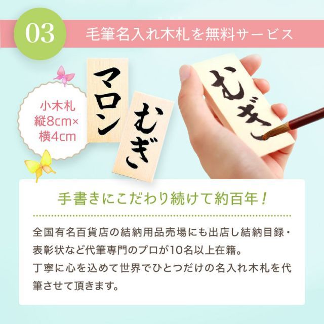 当店は昭和6年創業の老舗結納品店です。いわゆる「のし」の専門店です。複数の筆耕専属者が在職しておりますので、当店ではペットメモリアル・エンディングにサービスでお付けしている名入れ木札はすべて手書きで行っております。一筆一筆心を込めて代筆させていただきます。