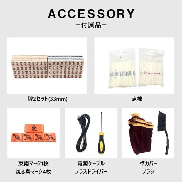 28mm麻雀牌2面(1卓分)、点棒・焼鳥/起家マーク、布カバー、点棒、電源ケーブル、日本語説明書