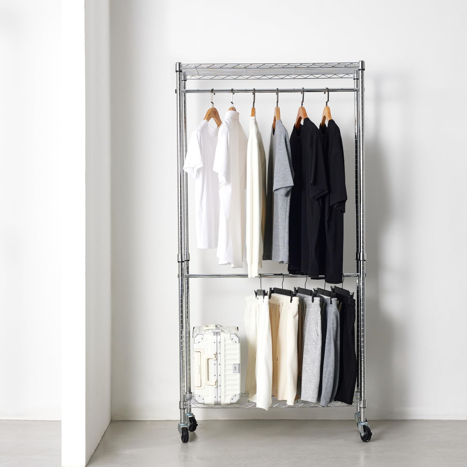 棚付き 幅91.4 キャスター付き x 頑丈 耐荷重181 kg 奥行35.6 洋服ラック 2段 高さ182.9 ハンガーラック cmクロム ベーシック