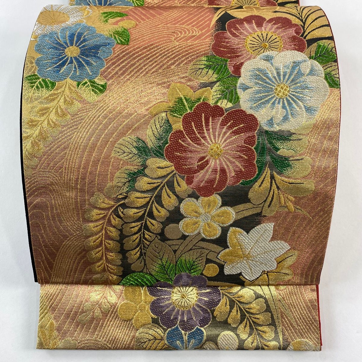 袋帯 秀品 草花 波 箔 金銀糸 朱色 六通 正絹
