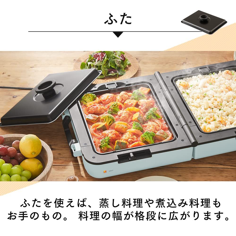 両面ホットプレートのワイドタイプです。大人数での食事にピッタリの大きさなので、普段の食事だけでなくパーティーにも大活躍!!◆ワイドサイズのプレートで2つの料理を同時に左右別々で温度調節が可能なので、適切な火力で2品同時に調理できます。また調理と保温を分けることで、作った料理を最後まで暖かいまま美味しく食べられます。◆3種類のプレートで楽しさ広がる!!平面プレート定番のお好み焼きはもちろん、パンケーキなどのデザートを作るのもおすすめです。たこ焼きプレートアヒージョやケーキポップ等、様々なアレンジ料理が楽しめます。さらに、焼肉プレート波状のリブで肉の油を落とし、きれいな焼き目をつけることができます。◆ふた付きで料理の幅が広がる付属のふたを使えば、蒸し料理も可能なので、焼き物だけでなく幅広い料理が楽しめます。◆お手入れラクラク!!着脱式だから、プレートを外して丸洗いが可能で、お手入れも簡単です。◆折りたたみ式で収納コンパクト全てのプレートとふたがまとめて収納できます。持ち手が付いているので持ち運びも楽に立てておけるので、狭いスペースにもすっきり収納できます。幅広く料理も楽しめる便利なホットプレートで毎日の美味しいをお楽しみください。【商品詳細】商品サイズ(cm)/使用時:幅約64.7×奥行約36.3×高さ約9.3/折り畳み時:幅約16.7×奥行約36.3×高さ約34、製品質量(全てのプレート・ふた装着):約6.8kg ●電源:AC100V(50/60Hz共用)、定格消費電力:1300W ●ヒーター:650W×2、温度設定:切・保温・約140℃・約200℃・約250℃ ●電源コード長:約1.8m、セット内容:本体、ふた、平面プレート、焼肉プレート、たこ焼きプレート