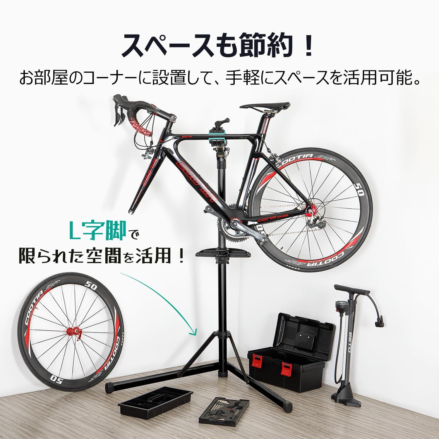 高さ 角度調整 耐荷重50 kg E-バイク対応 ワークスタンド メンテナンススタンド 軽量 アルミ製 電動アシスト自転車 折りたたみ式 収納性 持運びに便利 工具トレー付き CT-RS 07 A-MG