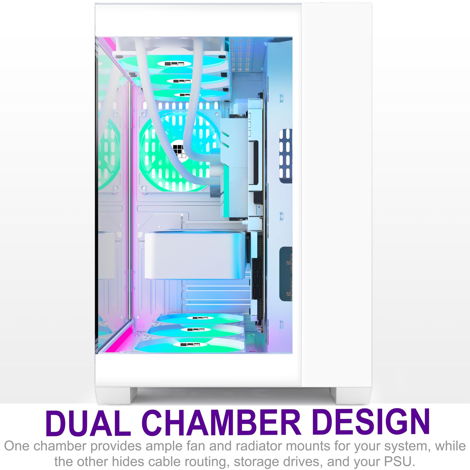 【270°パノラマデュアルキャビンデザイン】FOIFKIN F600 PCケースは、なめらかでモダンなデザインを採用し、270°のパノラマ強化ガラスパネルで構成された広い視野を実現します。完全に透明なガラスカーテンウォールのデザインは、ハイエンドのハードウェアコンポーネントに高品質のディスプレイプラットフォームを提供します。強化ガラスは遮音性に優れており、オフィス/ゲーム環境での快適性が高く、工具を必要とせず、分解が簡単です。