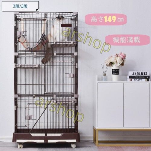 猫 ケージ キャットケージ ペットケージ キャスター付 猫ゲージ 大型 多頭飼い ネコドア キャットハウス 1段2段3段 留守番 保護 脱走防止 おしゃれ 3段 ピンク
