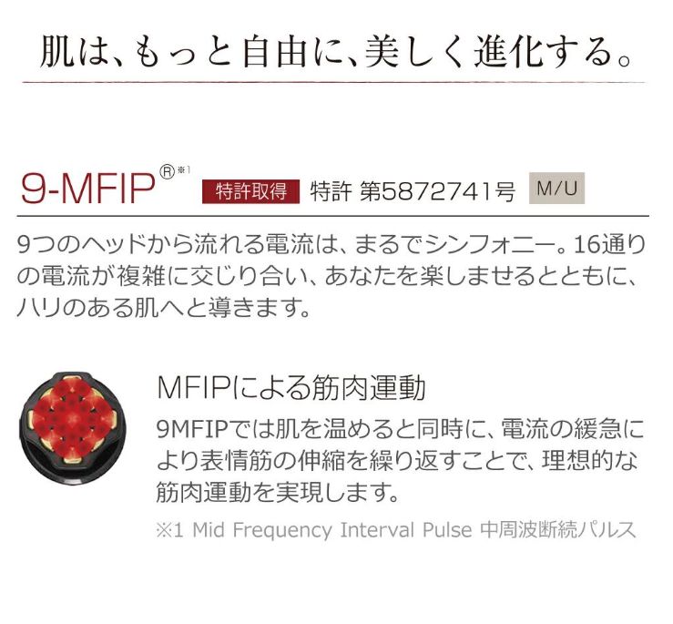 9MFIPでは肌を温めると同時に、電流の緩急により表情筋の伸縮を繰り返すことで、理想的な筋肉運動を実現します。