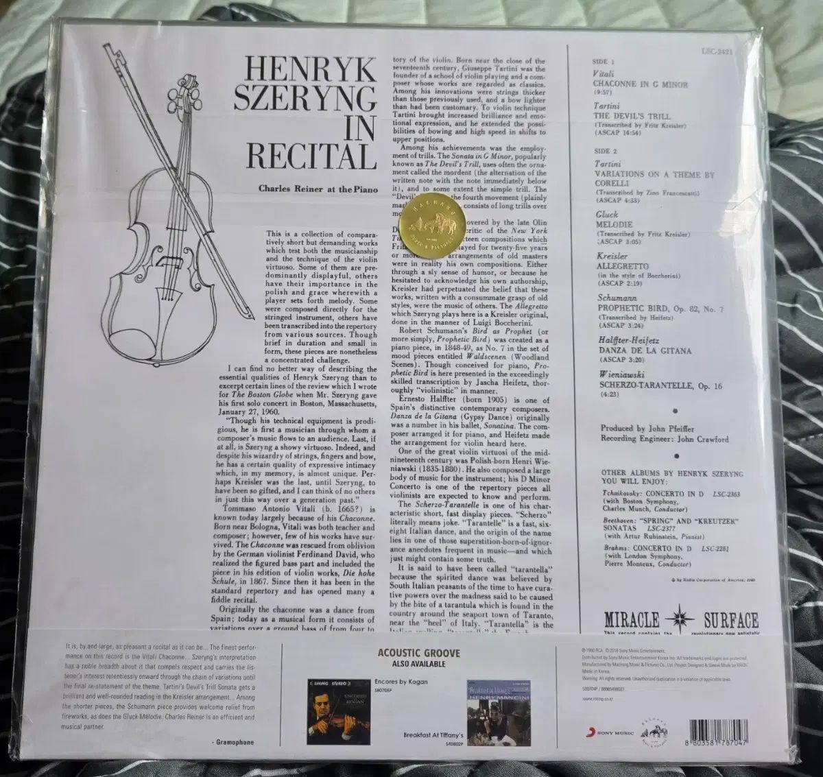 ヘンリック・シェリング・リサイタル未開封LPが発売中です。写真でわかるように、プラスチックラップのない新品です。重さは半180グラムで、音質も優れています。