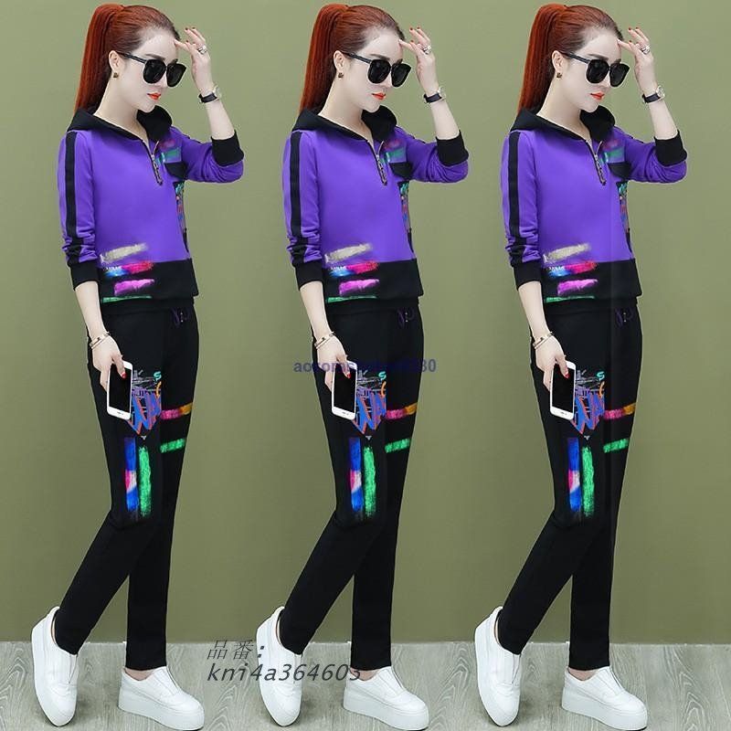 セットアップ レディース 上下セット ジャージ フード付き プルオーバー 落書き 運動着 スポーツウェア ロングパンツ ジョグパンツ kni 4 a 364603