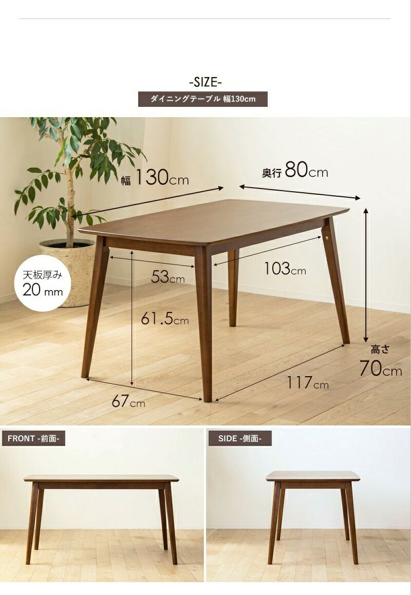シンプルで馴染みやすいデザインと、細かい部分までこだわった仕上げの高品質なダイニングシリーズ「スイーツ」。天然木ラバーウッドをふんだんに使用しておりますが、木目の綺麗な質の良い材料を用い、角部分の面取り加工や表面をウレタン樹脂塗装で仕上げることで、人に優しいなめらかな手触りを実現。さらに化学物質などに敏感な方や、小さなお子様がいらっしゃるご家庭でも安心の低ホルムアルデヒド家具で、シックハウス対策に配慮しています。※こちらはダイニングテーブル5点セットの販売ページです。サイズテーブル:幅130×奥行80×高さ70cmチェア:幅46.5×奥行52.5×高さ80.5cm座面高:約42.5cm素材テーブル:天然木(ラバーウッド)、ウレタン樹脂塗装チェア:天然木(ラバーウッド)、ウレタン樹脂塗装チェア座面:ファブリック、ウレタン仕様セット内容:ダイニングテーブル幅130cm、ダイニングチェア4脚カラー:ホワイト木目商品重量:テーブル:約21kg/チェア1脚あたり:約6kg低ホルムアルデヒド:F☆☆☆☆耐荷重:テーブル天板約20kg、チェア約100kgテーブル:脚部のみ取付(組立時間目安:約10分)/チェア:完成品生産国:タイ天然木製品について本製品には天然木を使用しているため、木目や節の位置、木肌の色味などが一点ごとに異なります。これらは天然木無垢材の特徴であり個性と考えておりますので、予めご理解の上ご検討をお願いいたします。
