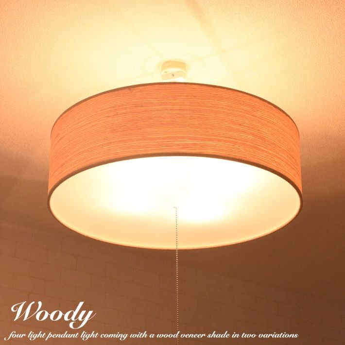 豪華にも天然木シェード。ウォールナット製のブラウンと、ホワイトオーク材のナチュラル。オリジナルのホワイト・ブラック同様、4灯のビッグなシーリングライトです。