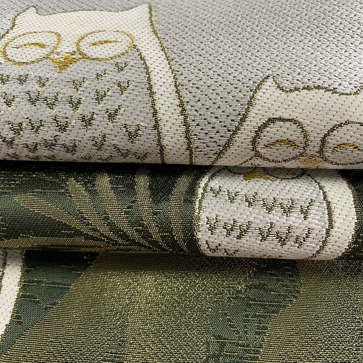 袋帯 フクロウ 樹木 金糸 箔 深緑 お太鼓柄 正絹