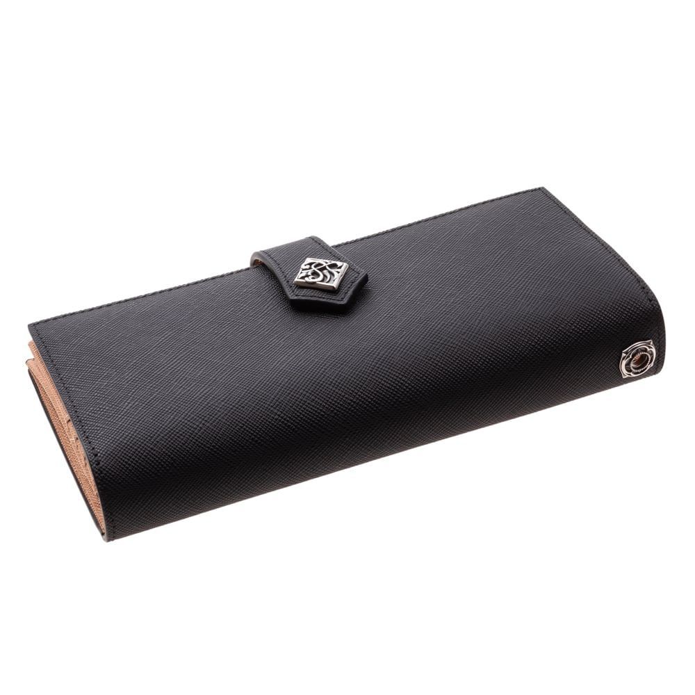 Scratch-resistant Saffiano cow leather gives this bi-fold long wallet a disciplined texture and refined sheen. The flap closes with a diamond-shaped concho that echoes our signature “A,” while the black exterior opens to a sophisticated beige interior for a quiet, luxurious contrast. Inside, function is choreographed for effortless use: an L-zip coin pocket for instant visibility, 18 card slots, five bill compartments, and one slip pocket—all laid out with elegant economy. Clean, even edges, precise stitching, a signature grommet, and a bespoke beige nylon lining complete the piece. Crafted under brand direction at a partner atelier with meticulous savoir-faire, it’s an everyday essential elevated to an artful object—and a gift of lasting taste for any wardrobe.