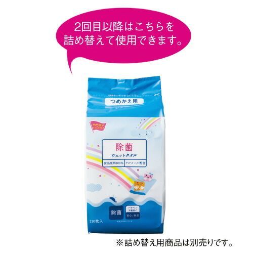 ●食品用原料100%。テーブル周りの清掃におすすめ●仕様/本体110枚入(1本あたり)●24本入●ボトルサイズ/直径105×170mm●シートサイズ/123×180mm●パラベンフリー●アルコール配合●詰替方式
