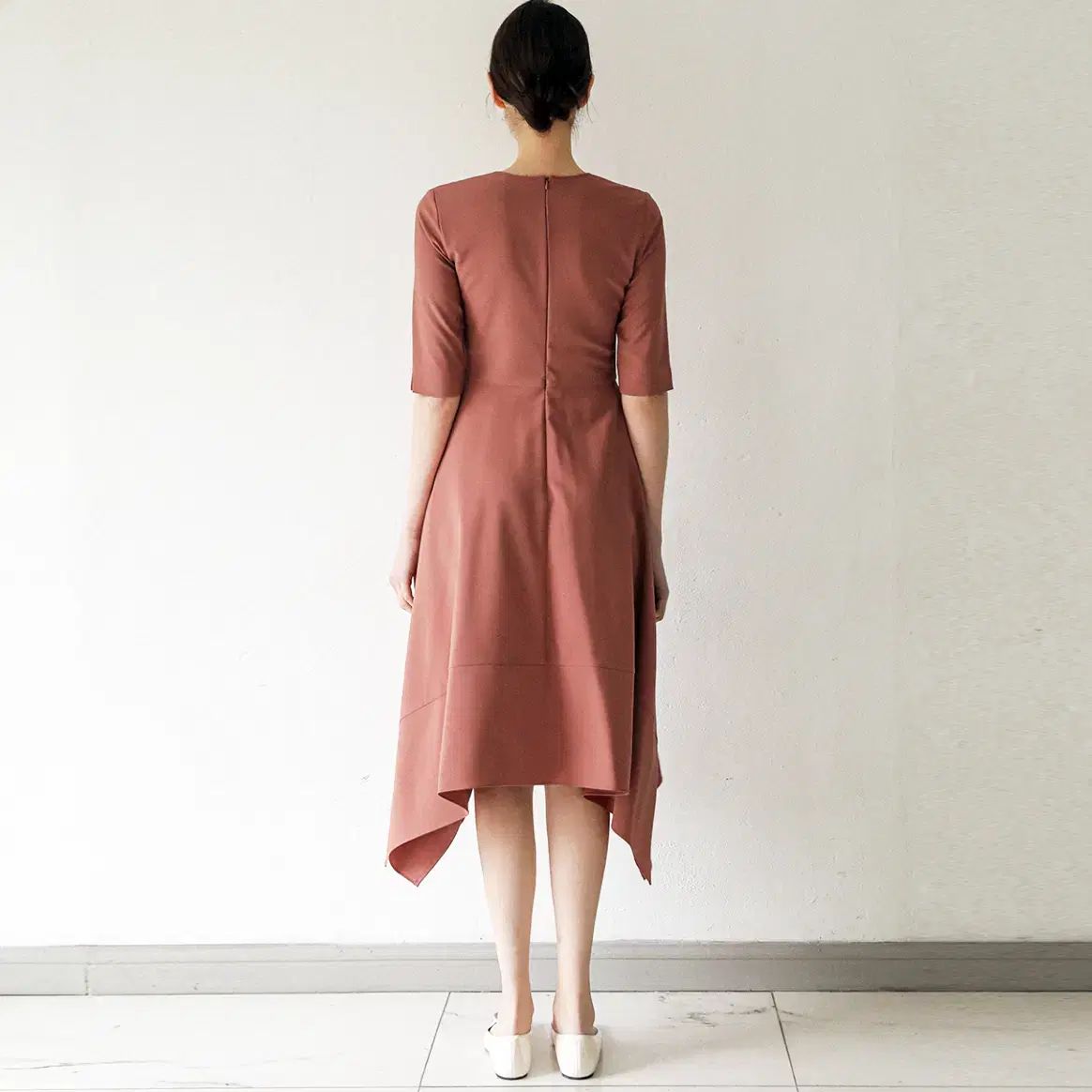 半袖丈にアシンメトリースカートLINEで立体的なシルエットディテールです