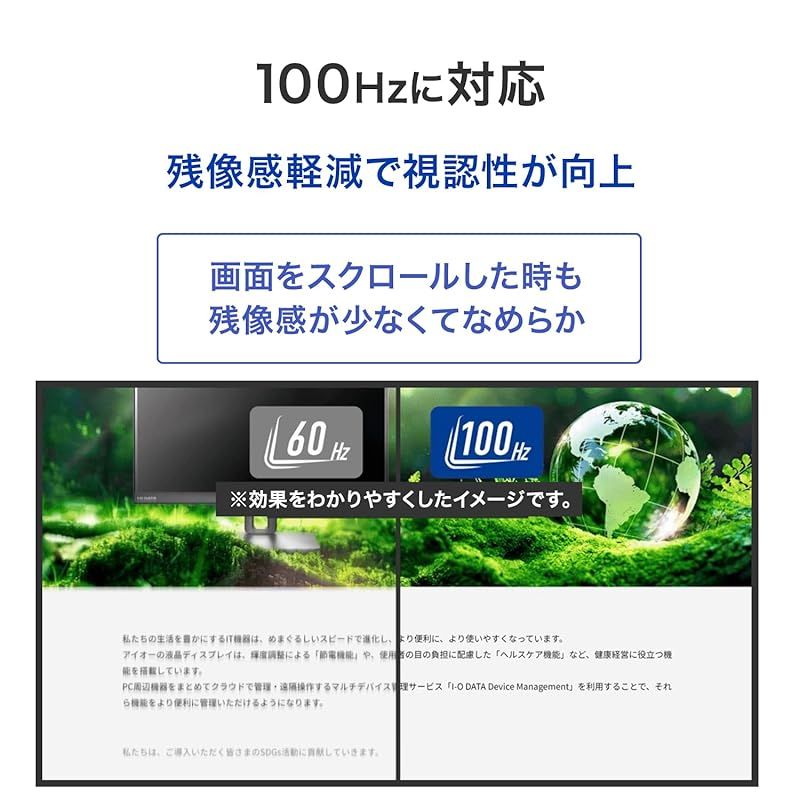 【100Hzに対応!残像感軽減で視認性が向上】一般的な60Hzのディスプレイより、約1.6倍高速に映像が書き換わります。画面のスクロールもスムーズになるため、残像感が軽減され、視認性が向上します。また、激しい動きの映像でもなめらかに楽しめます。※100Hzの出力に対応した機器が必要です。