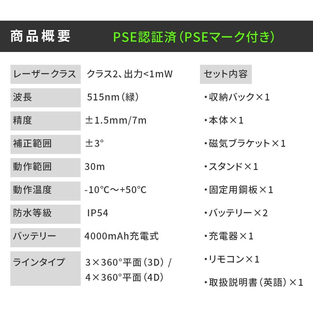 光源:緑色4x360、レーザー レーザー基準:クラス 2、 精度:±3mm /10m、 補正範囲±3°、 動作時間:約8時間 、全照射時、 防塵防水グレード:IP54、 仕事場所:室内 室外