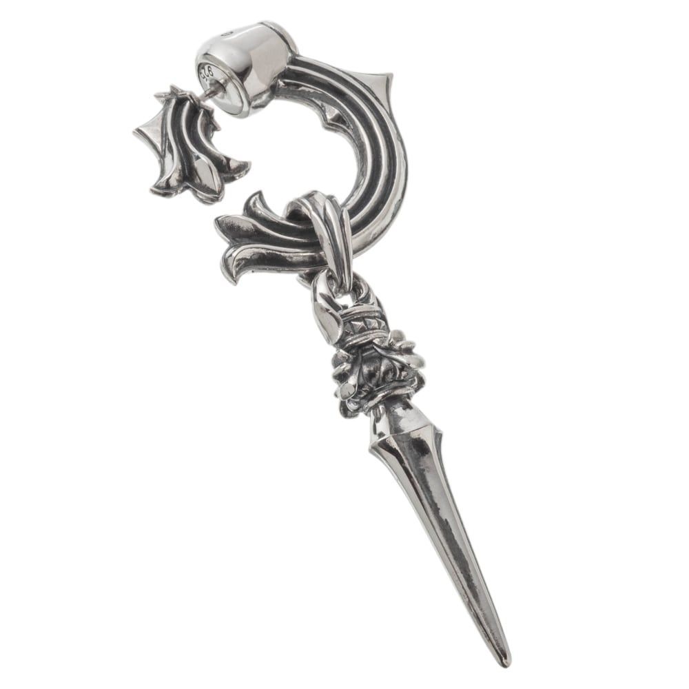 正面にすっと空間が走る、視線を奪うトリッキーなフープピアス。キャッチ側から立ち上がる立体構造は、耳たぶを抱くように回り込み、フルール・ド・リスの優美な曲線で気品を描きます。そこから銀の牙を思わせるスパイクがドロップし、揺れるたびに燻しの陰影と鏡面の艶がコントラストを生み、表情をドラマティックに変化。繊細な彫り込みが光を細やかに拾い上げ、ボリュームは程よく、着け心地は驚くほど快適です。キャッチにはブランドロゴと“925”、さらに三つのホールマークを刻印。確かな品質と美意識を物語ります。ブランドの意匠を精確に再現し、提携アトリエが手業で丹念に制作。一本でコーデの主役に、片側コーデやペア使いでも印象的。エレガンスとエッジを一つに融合した、現代的モダン・クラシック。ギフトにも最適です。