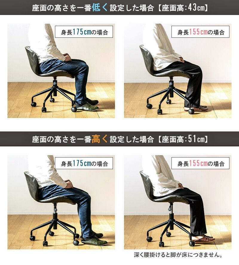 ヴィンテージ風のデザインがお洒落なSOHO・デスクシーンを演出するオフィスチェア。身体のラインにフィットして、お尻から背中まで包み込むようなシートデザインが快適な座り心地で作業環境をサポートします。360度回転する座面は、ガス圧昇降式で自由に高さ調節可。キャスター付きで移動もラクラクです。ブラックとベージュの選べる2色展開で、お部屋に合ったコーディネイトができます。サイズ本体:幅57×奥行57×高さ71-79cm座面高:高さ43-51cm素材座面:PUレザー、ウレタン、合板脚:スチール、粉体塗装仕様重量:約6.5kg耐荷重:約90gガス圧昇降式座面回転式お客様組立品(組立の目安:15分程度)