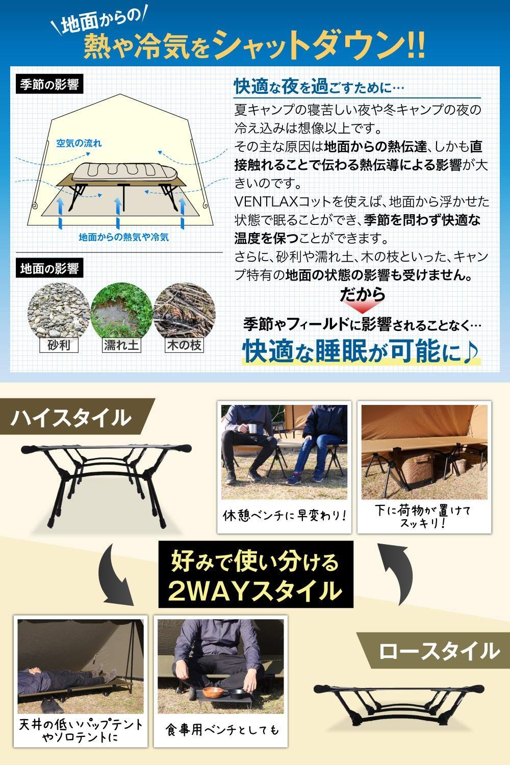 ✅【キャンプの眠りが今日から変わる】寝心地と寝返り時の静音性にトコトンこだわったVENTLAX 2WAY アジャスタブルコット。計7回もの試作と1年の開発期間を経て、ベテランキャンパーも納得する本格キャンプコットが完成!