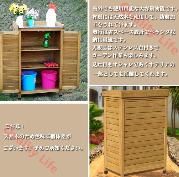 置 屋外 小型 木製 ステンレス操作台付き 木製物置 観音開き 収納庫 両開き 扉付き ベランダ ラック 庭 ガレージ 駐輪場 収納 掃除道具 倉庫 長さ85 奥行42 高さ95 cm ブラウン