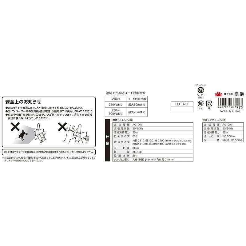【本体(CLT-55SLB)】定格電圧:AC100V、定格周波数:50/60Hz、定格消費電力:55W、口金サイズ:E26、設置場所:屋内、クリップ能力(最大):丸棒(単管)φ49mm/角材 厚さ40mm