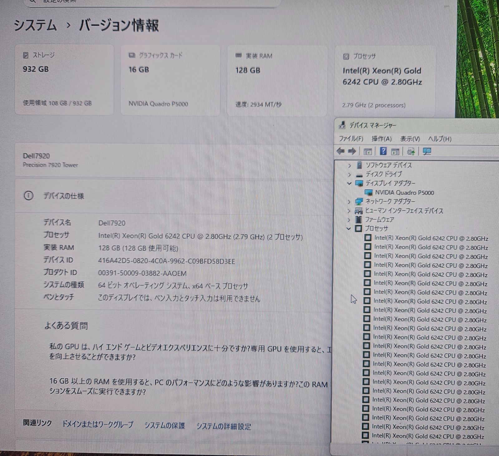 AI研究BTOパソコン Dell Precision 7920 Intel Xeon G 6242 第2世代 32コア64スレッド メモリ128 GB M.2 SSD 1 TB NVIDIA Quadro P 5000