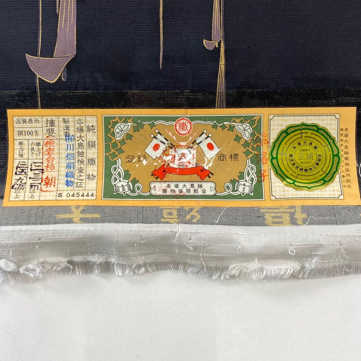 反物 小紋 大島紬地 証紙 花 金彩 黒 正絹